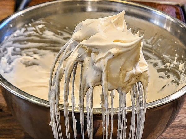 The whipped egg whites’ batch of pastry cream had great structure and was perfect for piping. The texture was fluffy and melts in your mouth. This is called a chiboust cream.