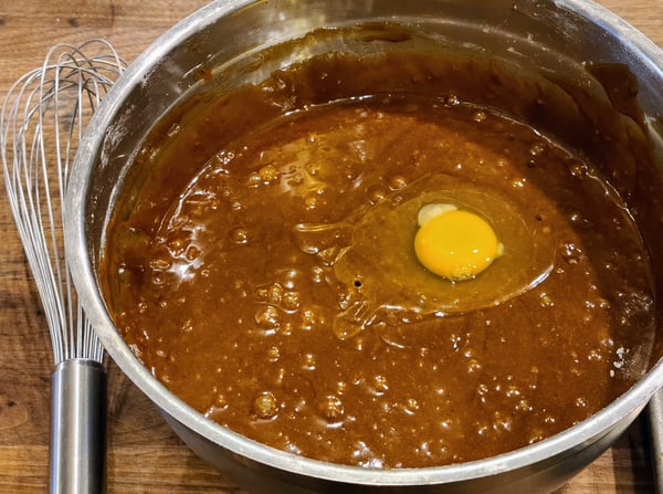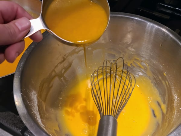- Temper the warm milk mixture into egg mixture gradually while whisking constantly. Return the mixture back to the saucepan.