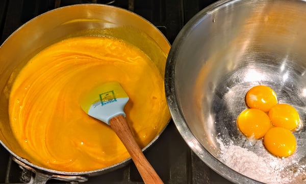 3. Temper the warm milk mixture into egg mixture gradually while whisking constantly. Return the mixture back to the saucepan.