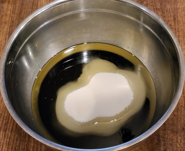 3. In a large mixing bowl, combine the molasses, sugar and vegetable oil. Add the ginger mixture, and stir until the sugar is dissolved. Set aside.