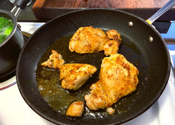 - Heat up your skillet, or braiser and drop the grape seed oil to the pan, sear the chicken thighs on both sides until golden brown