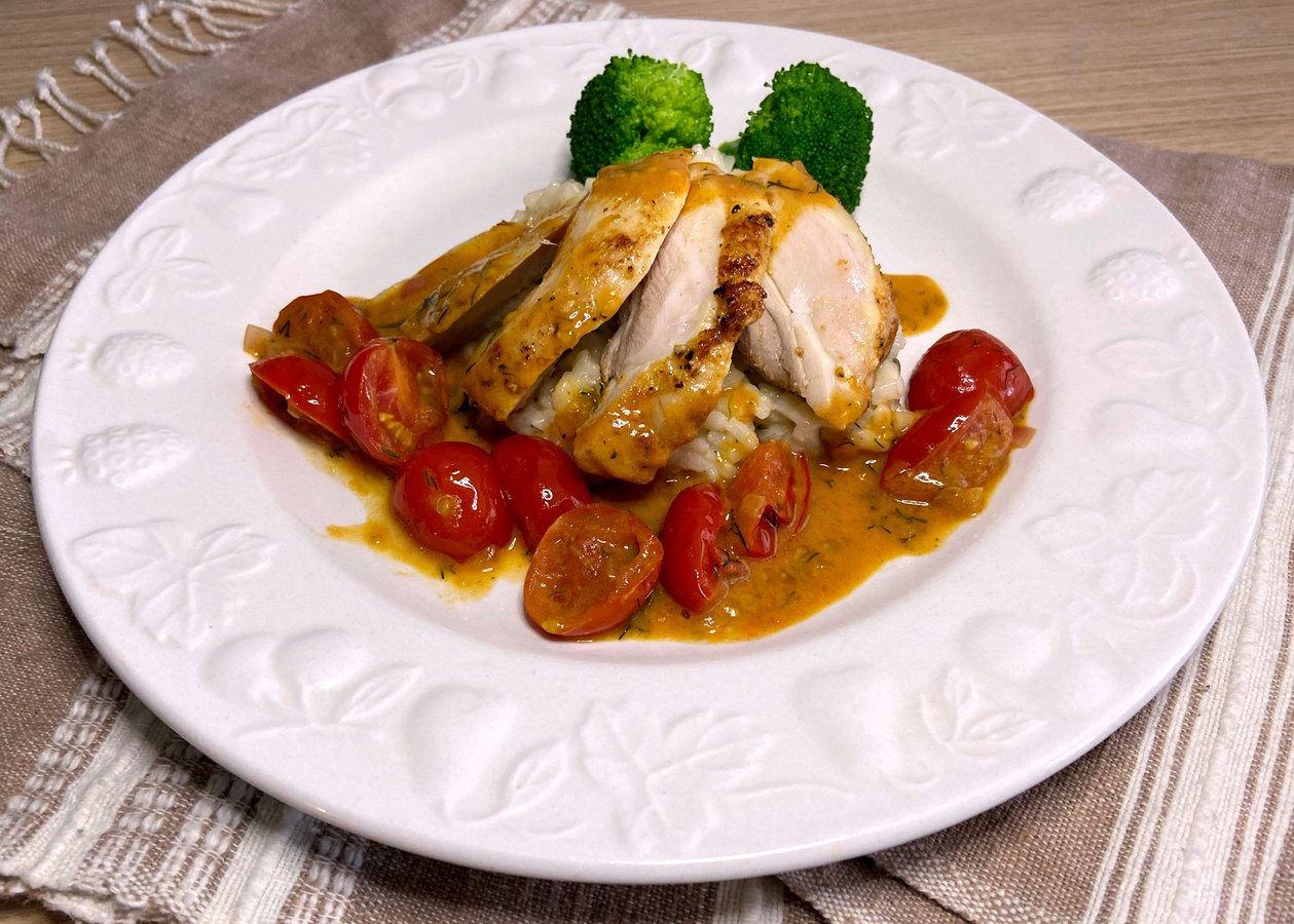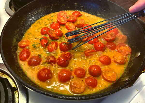 - Add the sherry vinegar, once the liquid is reduced to half, add the cherry tomatoes and dijon mustard, add salt and pepper to taste, finish with the chopped fresh dill.