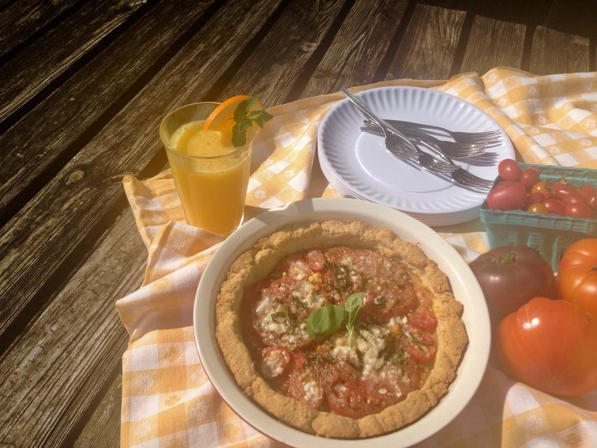 There are dozens of recipes for this summer time treat. This is my favorite, and I make it throughout the season. You can use any tomatoes you like, whether you have dark purple heirlooms, the ubiquitous Big Boy, or even meaty Roma style. Small cherry tomatoes can be halved and tucked in spaces around the larger slices. As long as they are very ripe and tasty, any type or combination will work. This recipe has a slightly crunchy crust thanks to cornmeal, which gives it an interesting texture as a great foil to the rich creamy filling and the luscious tomatoes on top.