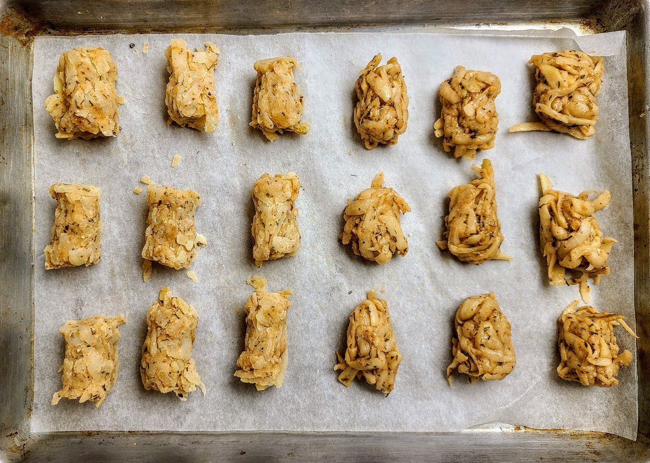 I used potato starch as a binder but flour, tapioca, or cornstarch may also be used. I seasoned my tots with garlic, onion, paprika, salt, pepper, and dried thyme.