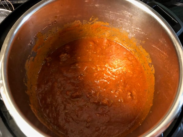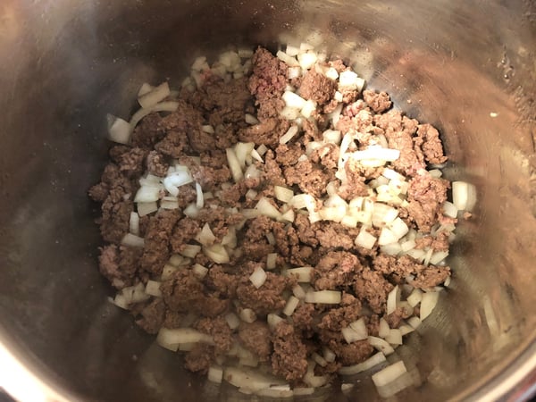 1. Cook and stir ground beef in inner steel pot of pressure cooker set to Sauté. Sauté until meat is browned and broken up into uniformly small pieces, 5 to 10 minutes.