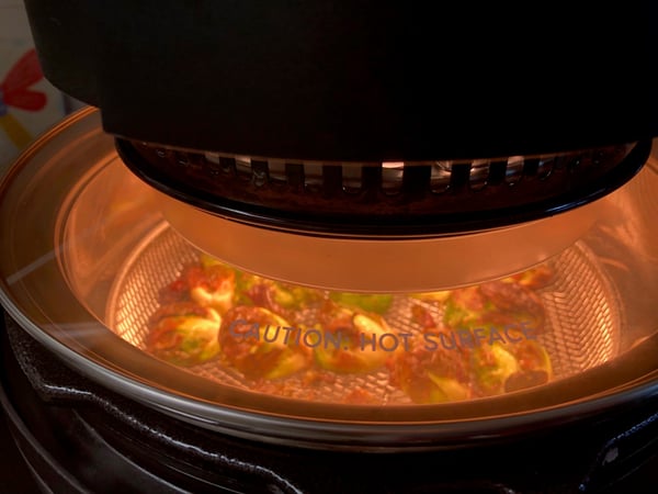 The instructions are filled with danger warnings about burning yourself so you need to be very careful when using the CrispLid. As indicated by its fiery red glow that kind of looks like something from outer space, this sucker gets hot! That's why they include a silicone mat to set the lid on when you take it off of the pressure cooker. If the handle is not locked into place, the unit will also not turn on. While air frying is a great activity for kids since they love to bread food, I'd suggest letting the adults handle the CrispLid.