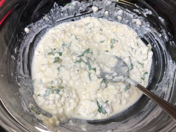 6. Stir cottage cheese, 1/2 cup mozzarella cheese, 1/2 cup Parmesan cheese, egg, basil, salt, and black pepper together in a large bowl.