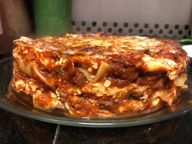 7. Spread 1/2 cup meat sauce into the bottom of a 7-inch springform pan. Place lasagna noodles (enough for a single layer, about 1½ to 2 noodles per layer) in a single layer over meat sauce, breaking noodles as necessary to fit the round pan.