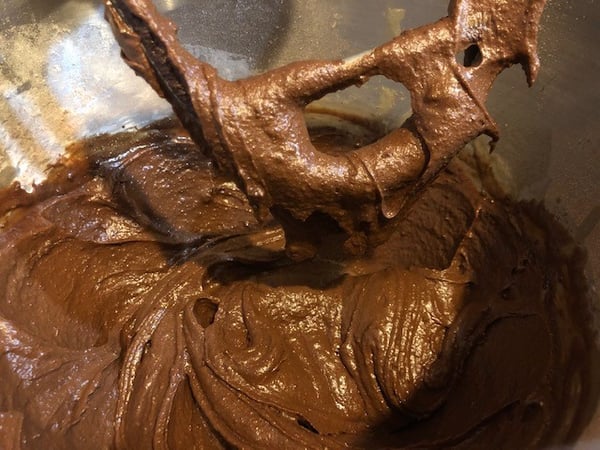 - Add eggs to liquid ingredients. Mix to combine (by this point the chocolate should not be hot, but make sure so as to not cook the eggs!)