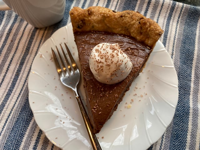 5. Top each chilled slice of pie with a dollop of the whipped cream followed by chocolate shavings or cocoa nibs.