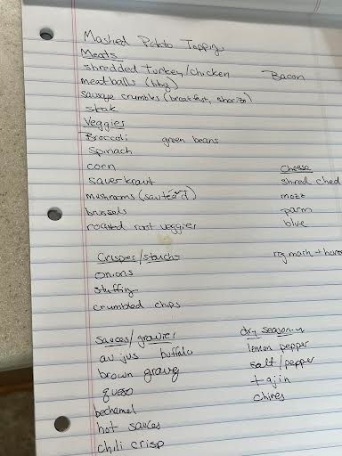 Here was my brainstorm session of things to put out for my “spudmasherie.” (And I apologize for whatever I spilled on my think tablet while I was brainstorming!)
