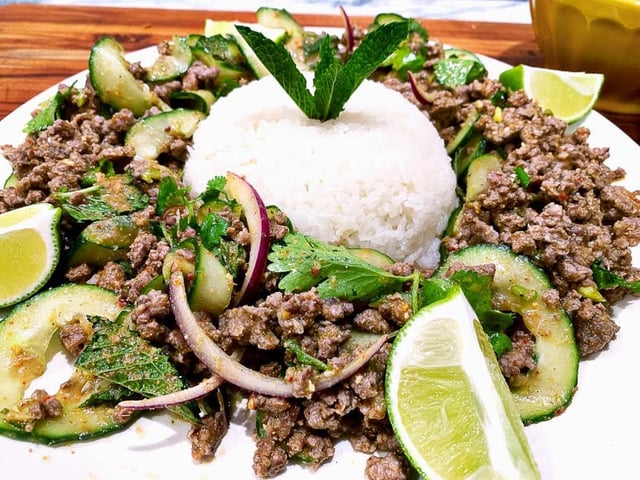 The meal was so memorable that when I was back in New York a few weeks later, I begged my sister to bring me an order of the incredible lamb laab. I packed it in my bag to go to the airport, carried it through security, flight delays, and the airport lounge (where I enticed a bartender to store it temporarily in their fridge!), all so I could get it back to Chicago to enjoy the unique flavors one more time. Sadly, the laab didn’t even make it home, falling victim to a feeding frenzy on the plane and leaving me craving it all over again.