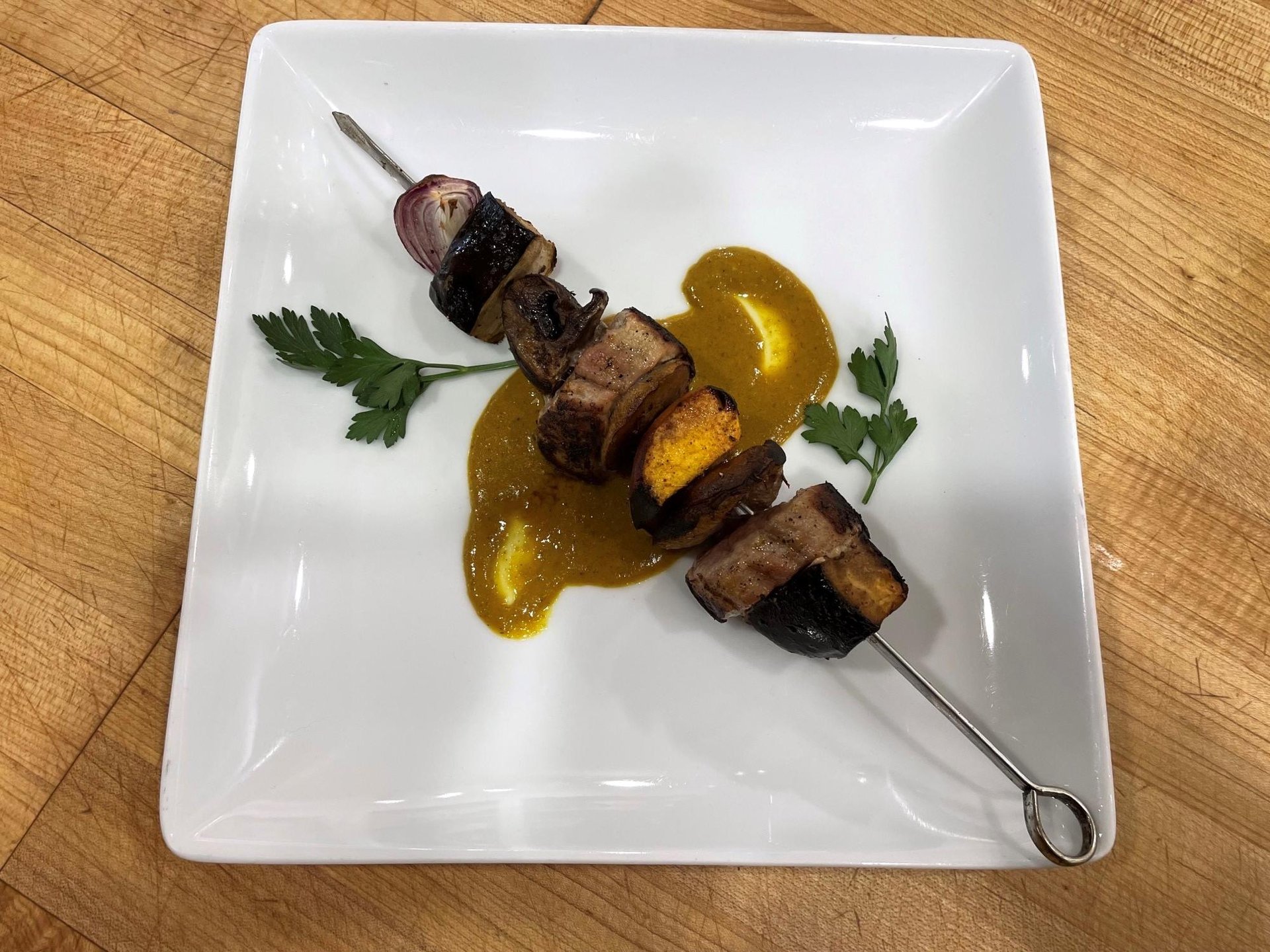 For the Shashlik I recently made, I used pork tenderloin, shiitake mushrooms, eggplant, roasted red pepper and a slice of ripe peach.