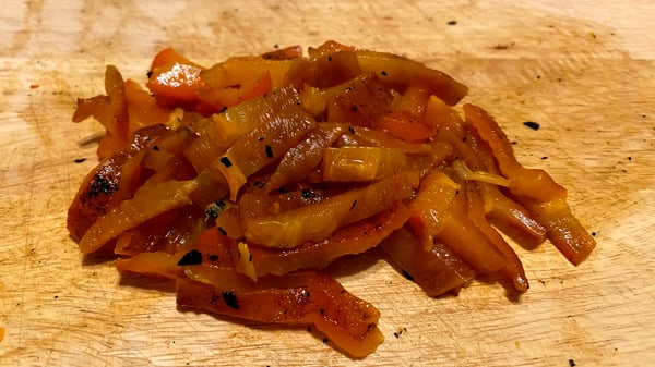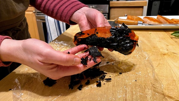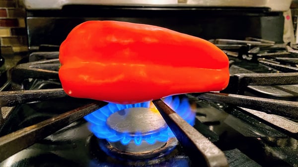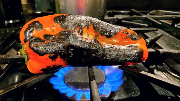 To roast a pepper, place it directly on your gas burner and cook, turning occasionally, until the skin is completely blackened on all sides. Place the pepper in a bowl, cover with plastic wrap and allow to steam for about 15 minutes. Remove the skin and seeds from the pepper, resisting the urge to rinse it, and cut as needed for your recipe.