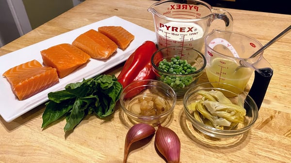 As I was taking inventory of the ingredients in my kitchen, the Frank Sinatra song, I Did it My Way, kept floating through my head because I had to improvise with what I had on hand, which was red peppers, artichokes, peas and basil. This version of the dish was fabulous, and it just goes to show you that you can sub out/in any ingredients you like based on what you have on hand. My recipe reflects the changes I made at home, so please feel free to alter the recipe as desired.