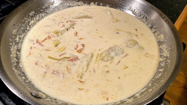 5. Stir in the chicken stock, heavy cream, roasted peppers and artichokes. Bring the sauce to a gentle simmer, and cook until the cream is of a coating consistency.