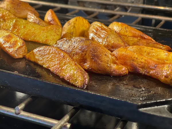 You can use any sheet pan or cast-iron pan to make your fries, but if you preheat the pan first, it helps to start the crisping as soon as it hits the pan. It also keeps the moisture in the potato. When we teach people how to sauté, we always suggest preheating the pan before you put the food in it to sear it. This works the same way in baking your fries. When you put the potato on the hot pan, it starts to brown within minutes because the moisture in the potato jumps away from the hot surface.