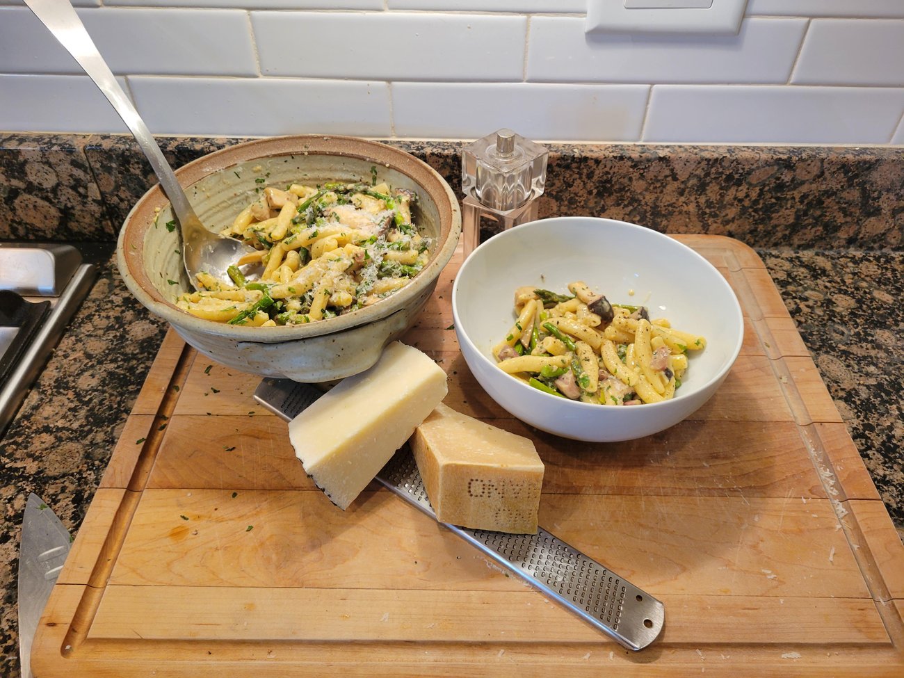 I chose to make a variation of Pasta Carbonara, which utilizes pancetta as a primary seasoning (along with black pepper and onion). I wanted to incorporate available spring vegetables to build on the nutritional content. I chose asparagus. I also used king oyster mushrooms, which are one of my favorite meat ‘fill-ins’ with their hearty texture (try grilling them skewered!).
