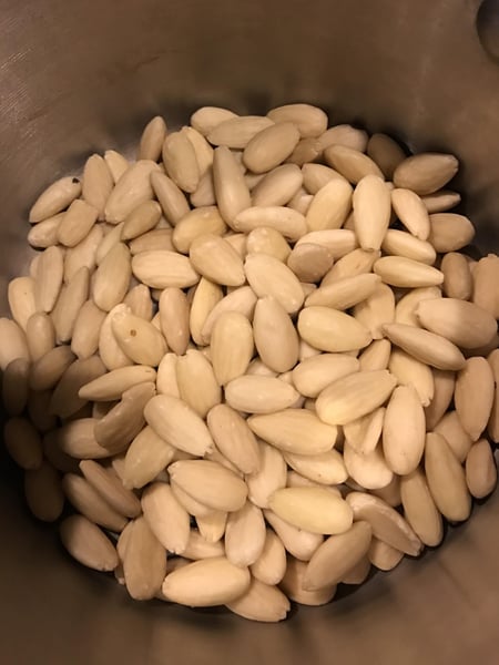 Place almonds in a small saucepan with enough water to cover by one inch. Bring to a boil over high heat, and boil for 10-15 minutes, or until the almonds look hydrated and slightly softened. Strain off the water, and immediately add the almonds to a blender or food processor, and add the ¼ cup of water, and blend for about 30 seconds to 1 minute, or until it looks smooth and curdy, but not completely pureed. You made need to add a splash more water.