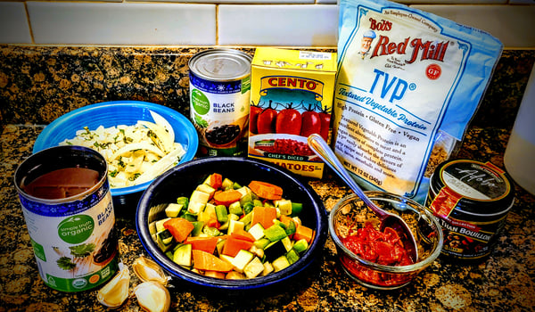 - Mix in tomato paste, then water, stock base, tomato, oregano, TVP and a bit of salt. Simmer for ten minutes.
