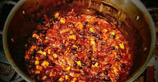 - Add beans, tofu, paprika, liquid smoke and Cowboy Crust®. Simmer on low for 30 minutes with a lid on, checking along the way for seasoning adjustments.