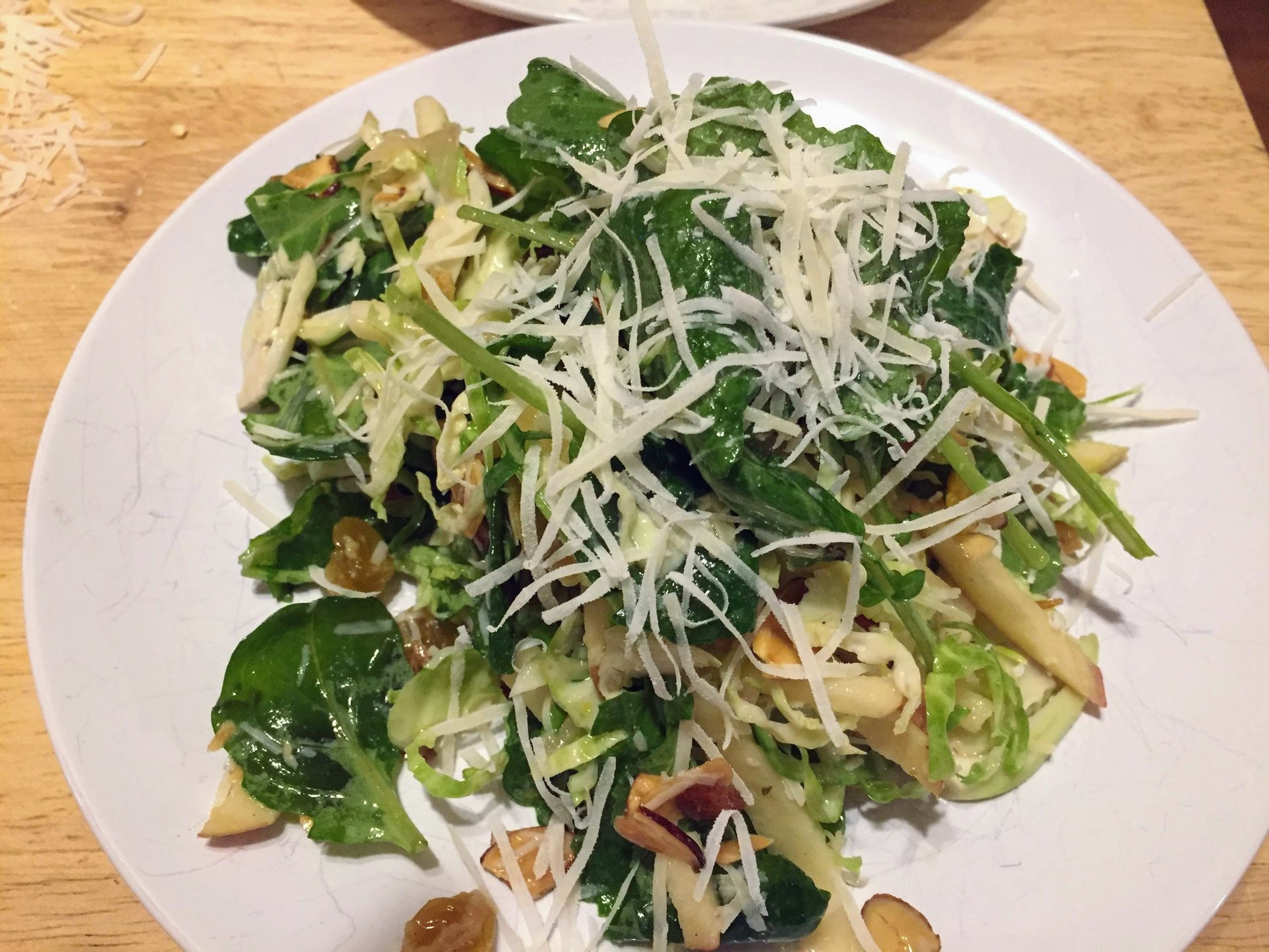 We still had half of the spouts left, so I decided to prepare them in a completely different way the following day. I made a very fall-focused, vegetarian salad featuring the sprouts raw and thinly sliced. In addition to the Brussels sprouts, I tossed in more fall favorites including baby kale and apples.