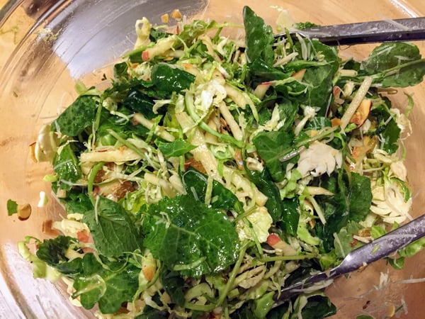 In a large salad bowl, I measured together the kale, thinly sliced Brussels sprouts (I used the thin slicing blade on my food processor), and the apples.