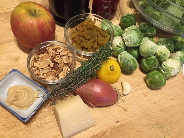 - To make the vinaigrette, I first started by sautéing shallots and garlic in a sauté pan with olive oil. I then added golden raisins, and allowed them to plump up a bit. The sweetness of the raisins really balanced the earthy flavors of the sprouts and the kale. It was such a great combination!