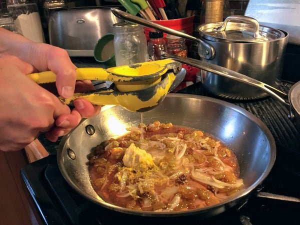 - To make the vinaigrette, heat a sauté pan over medium-low heat and add the olive oil. Gently sauté the shallot and garlic until aromatic, about 1 minute. Stir in the raisins and allow for them to plump up, about 2 minutes.