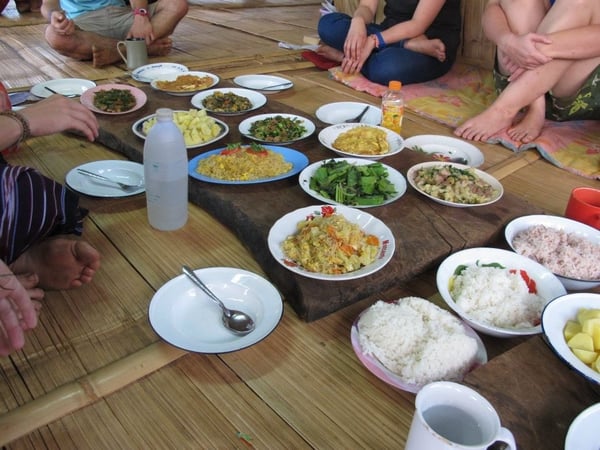 Here are all of the elephant sanctuary workers about to dig in to a delicious meal made for us by the village families!