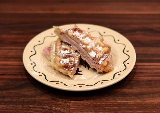 A traditional Monte Cristo sandwich is made of bread, ham, turkey, gruyere cheese and mustard. It is battered, deep fried and sprinkled with powdered sugar. Unless you own a restaurant with a deep fryer, it is pretty tough to deep fry a whole sandwich at home. It’s a difficult sandwich to make and then of course there is the fact that most people don’t eat a lot of deep-fried sandwiches. It hit me one day, the Monte Cristo could be the perfect thing to waffle! The batter on the Monte Cristo is essentially a pancake batter, so instead of deep frying I could just put the bad boy in a waffle maker and crisp the batter in there. I think the result was pretty stellar.