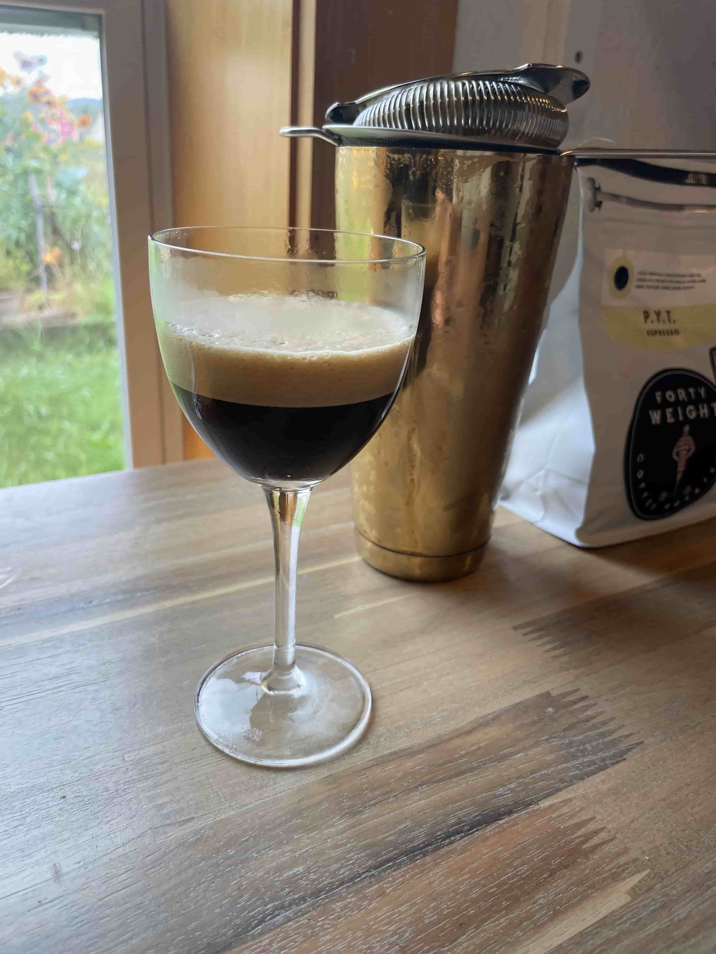 In addition to needing some type of espresso brewing equipment to execute this recipe you will also need a set of cocktail shaking tins, a glass for the finished drink, a scale capable of 1 gram precision, an espresso cup, and a Hawthorne strainer. Optional equipment that I use are a Booker and Dax cocktail cube (adding this to your shaking tins allows you to get the superior body associated with shaking with one big ice cube without actually needing to always have hug ice in the freezer), and a fine mesh tea strainer for catching any little bits of ice that make it through the Hawthorne strainer.