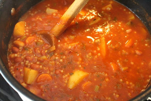 4. Raise the heat and bring to a full boil. Reduce the heat and simmer slowly, uncovered for about 1 hour or until vegetables are just tender.