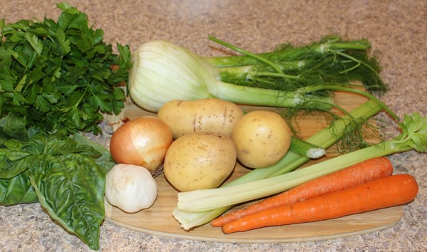 3. Stir in the tomatoes, potatoes, fennel, parsley and basil. Add water so everything is submerged by at least 1 inch. The soup may seem too thin but will cook down.