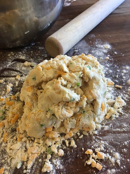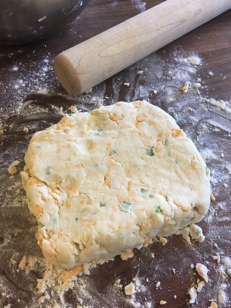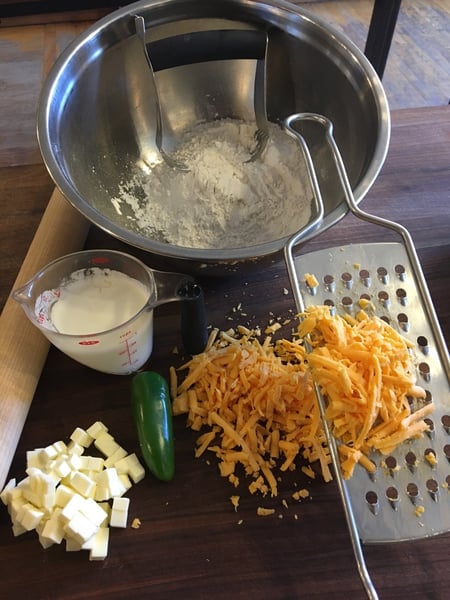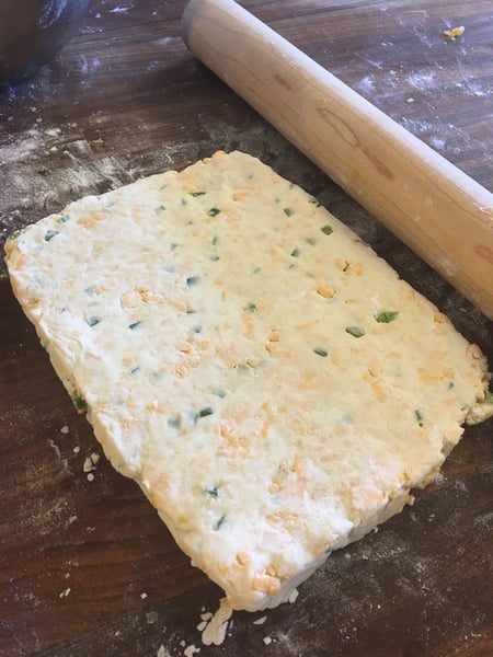 This is a standard biscuit-method recipe. I substituted heavy cream for the buttermilk, as I did not have any on hand. I also changed the flour mixture. Instead of only all-purpose flour, I used some cake flour blended with the AP flour. I also added jalapeños and cheddar cheese.