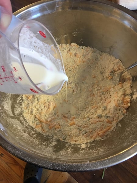 - Add the cream and honey mixture to the flour and using a fork, gently blend the ingredients together. Stop mixing when the dough has absorbed all the cream and has a clay-like consistency.