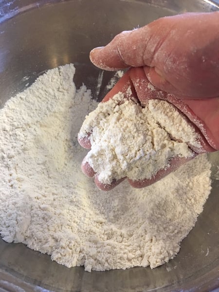 - Add butter cubes to the flour mixture and use a pastry blender to combine until large pieces of butter are no longer visible, just like this:
