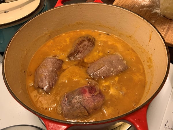 Pour in the water and stock, and return the roulade to the pan. Bring to a boil, and reduce to a simmer. Cook, covered, until the meat is tender, about 45 minutes.