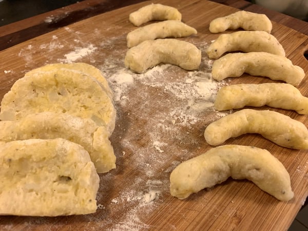 - When the potatoes are cool enough to handle, remove their skins and place them on a lightly floured surface.