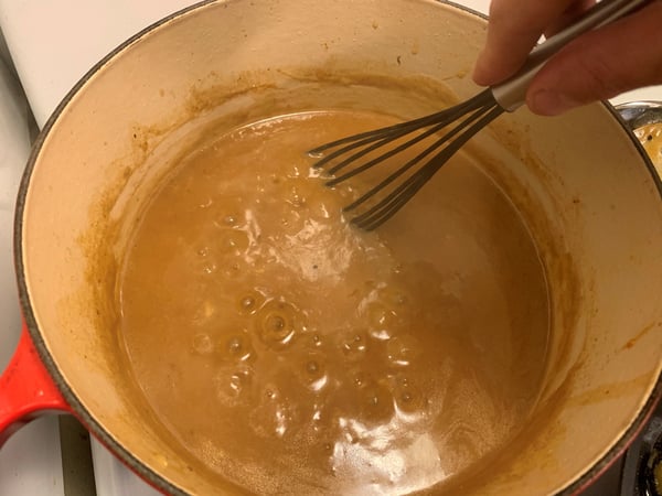- Reduce the heat to medium low, and add the butter. Once the butter has melted sprinkle in the flour to make a roux. Cook the roux until lightly toasted.