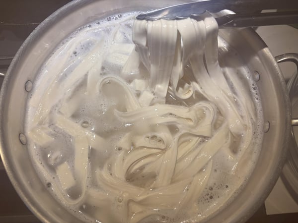- Bring a large pot of salted water to a boil, and cook the noodles until they are tender.