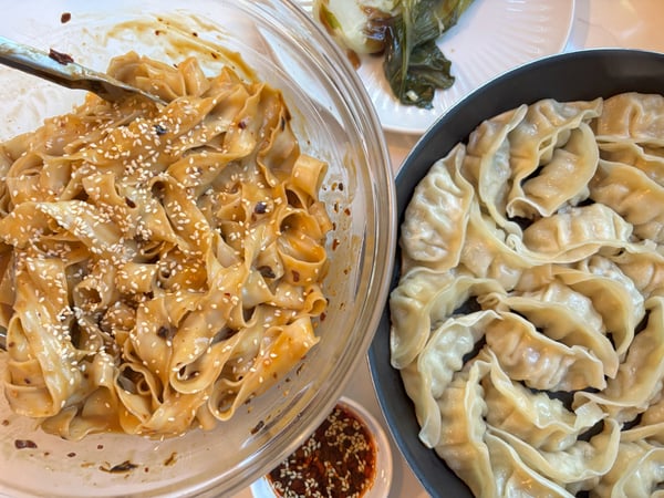 I served our simplified version of Dan Dan noodles with some braised baby bok choy and pot stickers.