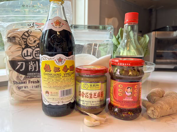 In addition to the Chinese sesame paste and the chili crisp, whisk in soy sauce, black vinegar, sugar and minced garlic. Set your sauce aside while cooking the noodles.