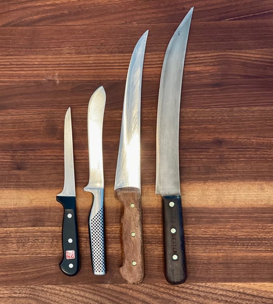 Butchering knives are also narrow at the base and tip but they should not be confused with slicing knives. Butchering knives have curves to the blade, which is also concave in the middle of the blade, and the blade is often flexible. If you never clean a tenderloin, skin a small fish, bone a chicken or clean shrimp you probably don’t need one. If you have something that looks similar to the boning knife but the blade isn’t flexible, it is a butcher knife, they come in all lengths and have lots of subtle variations. Unless you are a hunter or purchase meats in primal cuts these types of knives may not offer a lot of functionality.