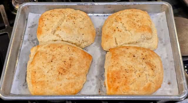 7. As soon as the biscuits come out of the oven, brush the tops with melted butter.