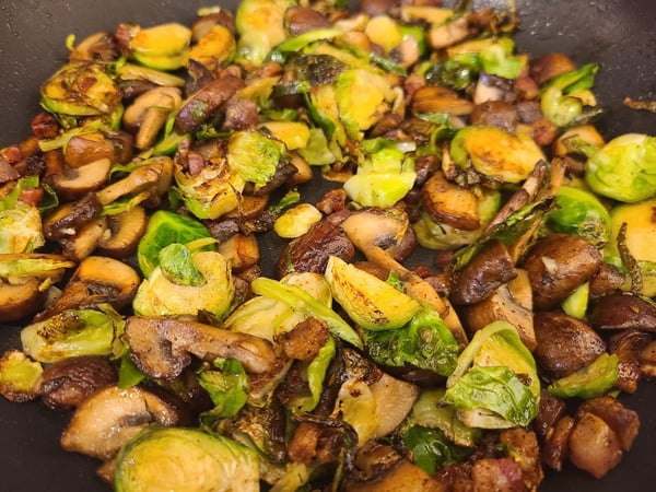 I took my leftover brussels sprouts, mushrooms and pancetta and sautéed everything to heat it through. I diced up my turkey roulade and added that to the mixture as well.
