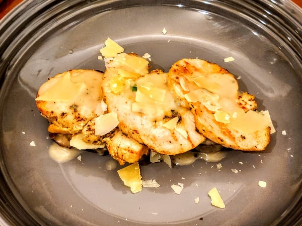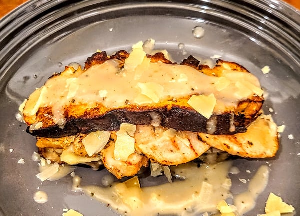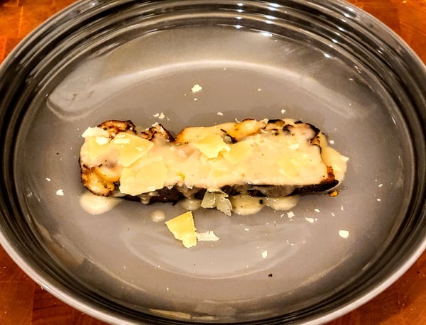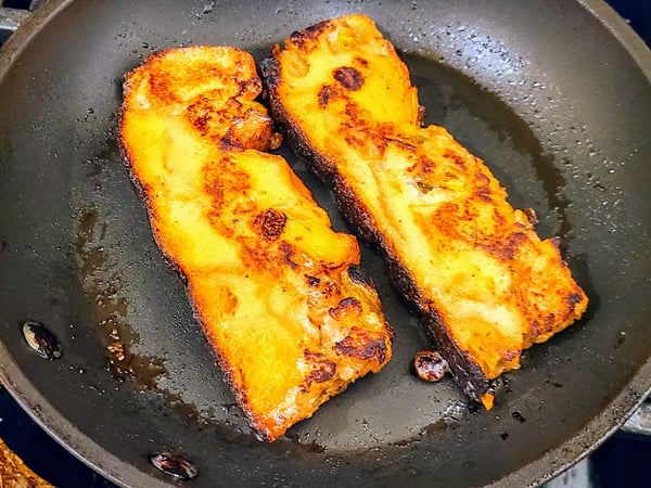 I started by searing the sliced stuffing in butter until crispy on both sides. While my bread was crisping up, I rewarmed my gravy in a pot and added some Parmesan cheese. Any cheese can be used for this version of the recipe or omitted, if preferred.
