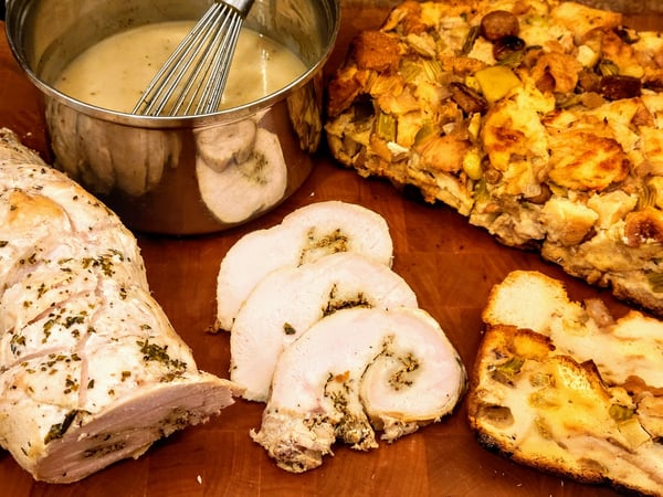 I was inspired to write about what to do with Thanksgiving leftovers after my last virtual private event I taught where I made a turkey roulade, stuffing, and gravy. I also had cranberry orange ginger sauce and sautéed brussels sprouts with mushrooms and pancetta leftover from another class. Check out Andrea Miller’s blog that provides a recipe of how to make a turkey roulade;, it even has a video of me stuffing and rolling the turkey breast. After two days of eating turkey and stuffing, I was looking to be more creative with this food so I wanted to share with you what I came up with.