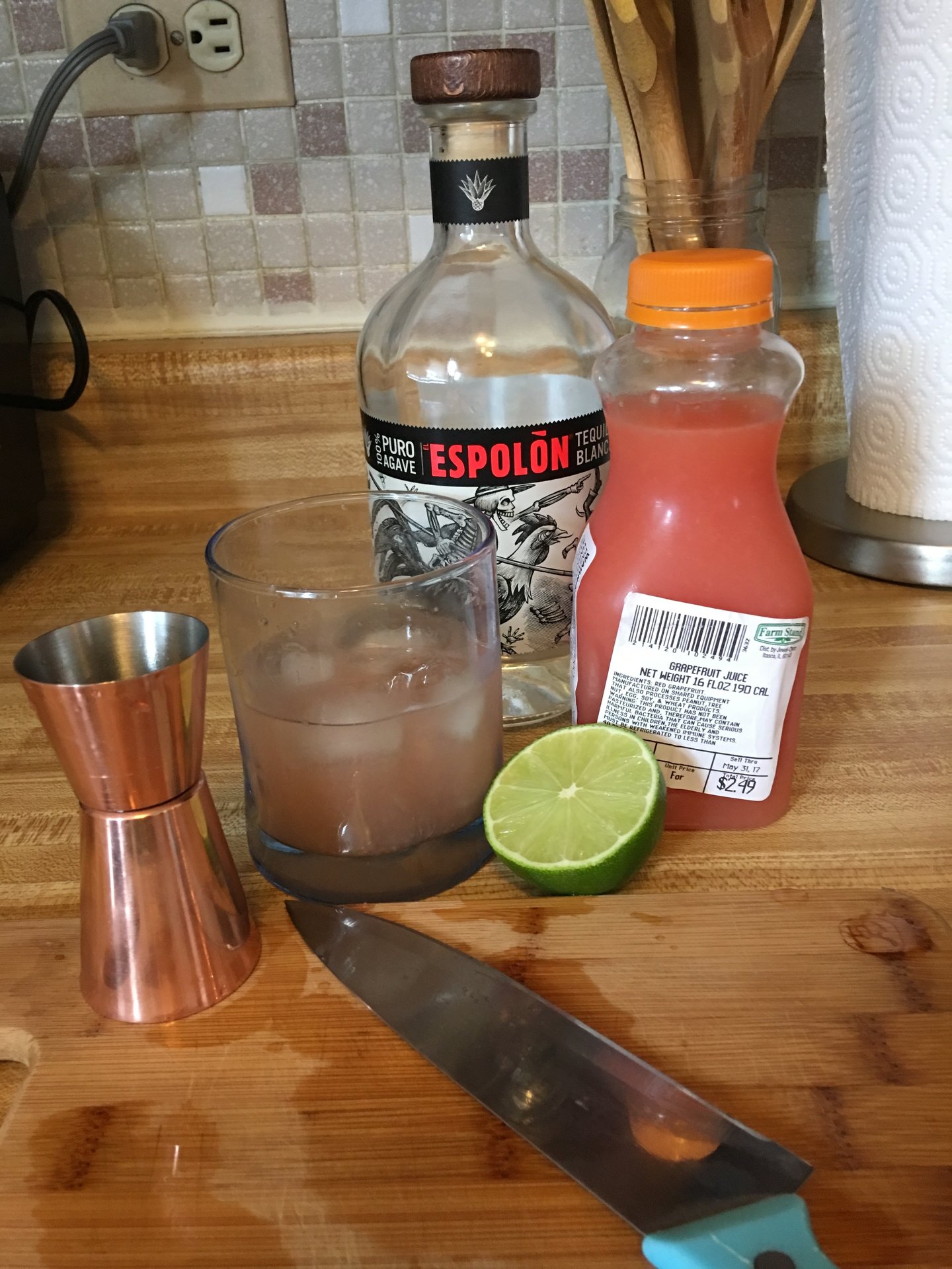 This cocktail is best shaken, but can be also enjoyed built in a rocks glass. Whether you are building in a glass or shaker, start with your ice. Pour two ounces of grapefruit juice, two ounces tequila, and squeeze half of a lime. Then either shake in your cocktail shaker or stir very well in your glass. Top the whole drink with club soda (or Sprite, if you like a little extra sweetness). It's important not to shake or stir the cocktail with club soda, otherwise it could go flat. Now it's time to enjoy this classic, refreshing drink!