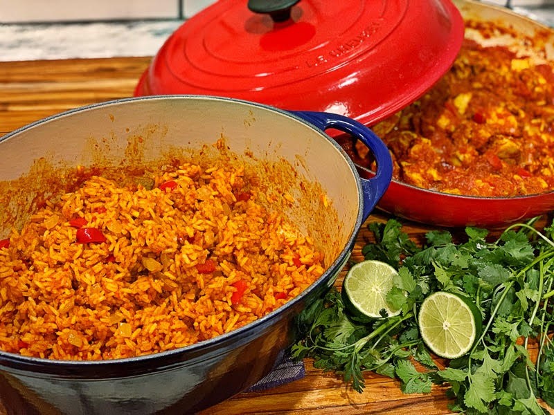 11. Fluff rice with a fork and serve topped with chicken stew.